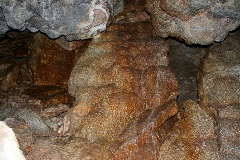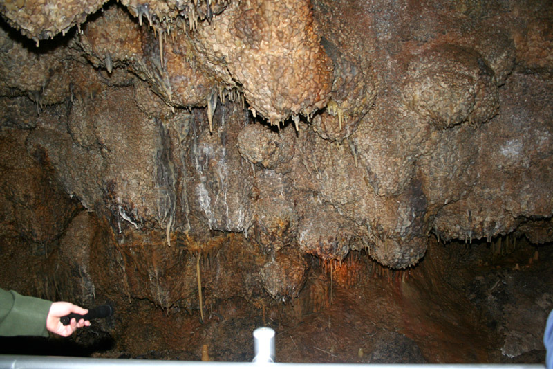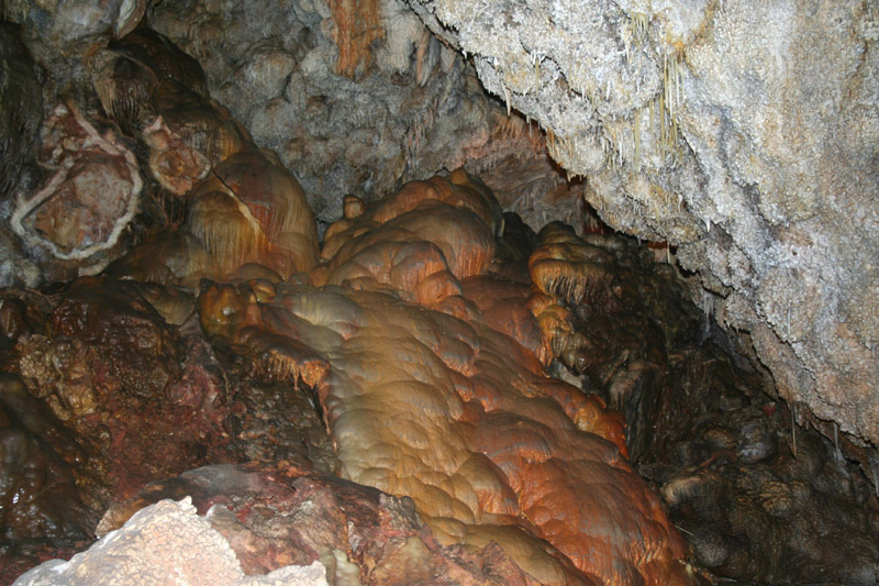 Looking as if they just froze in place, these larval stalactites are hundreds of years old, and will not achieve their goal of reaching the cavern floor for many thousands of years more. |