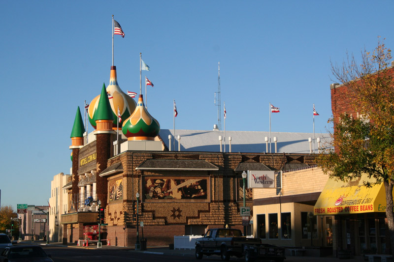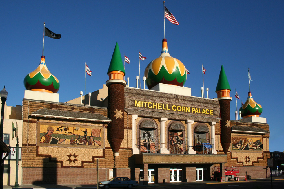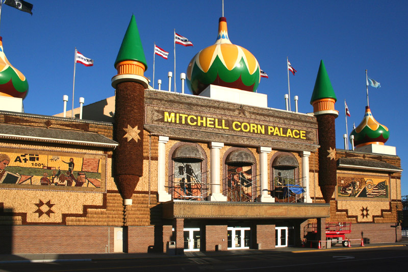 The Corn palace is completely fronted with corn. All of the drawings and decoration are crafted of corn stalks, husks, and cobs. Corn does not exactly wear like iron, so every year, the designs are replaced by new ones. |