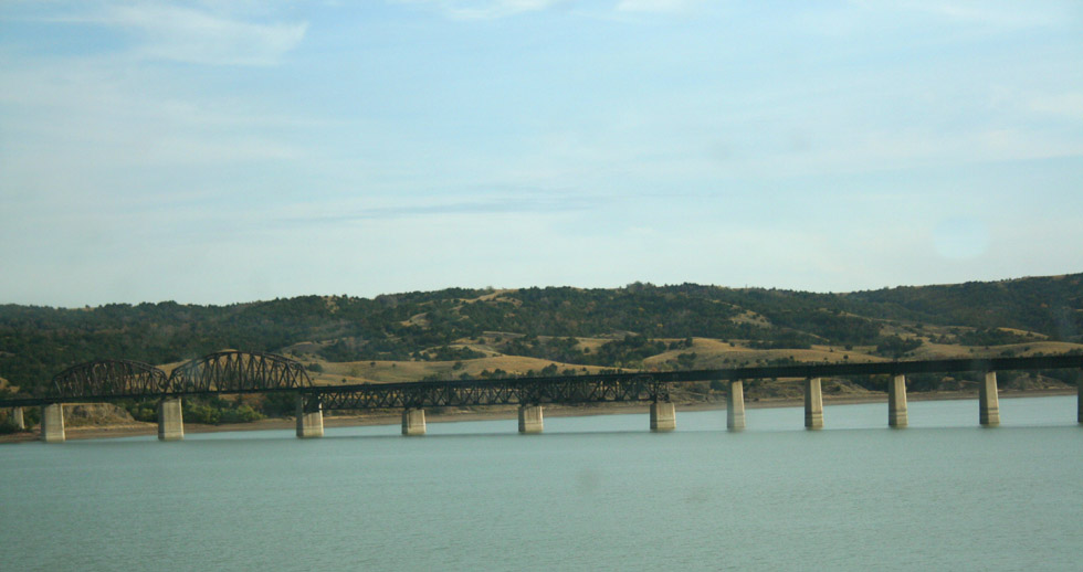 Above: The former train depot has been turned into a sort of a mini mall. But it is time to hit the road again, and head out of town. I was hoping to make the Missouri river by nightfall. Left: The towns are great, can be quirky, offer many attractions, people to meet, and things to do; but the road offers it's own brand of entertainment. I decided to stop at the Missouri River for a while, at this rest stop and information center. Below: A look back towards the rest area, from a spot among one of the many trails leading down to the river. |