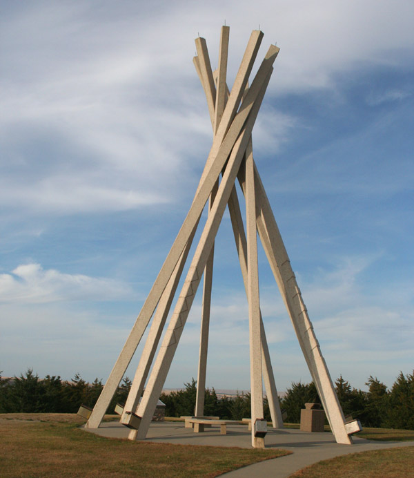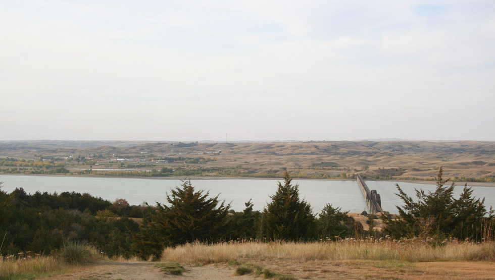 The tipi has become sort of the unofficial symbol of South Dakota. It is very appropriate. Large reservations still exist here, and this was one of the last areas where Indian wars were fought, and rebellions occurred, as late as the 1960's. Many of the tribes, most notably the Lakota's, were not native to this area, but had been transplanted here by the government, after having taken over their lands, east of the Mississippi. Like most government outrages, displacement of the Indians was said to be for their own good. The Indians were moved out here, to separate them from the Europeans, who would settle the eastern lands. It was thought that the two cultures could not coexist, and that the Indians would be happier with "their own kind." It was certainly true, that the whites preferred the arrangement. This was the first instance of Separate But Equal, a strategy which would be attempted a century latter, with American blacks, with about the same results - rebellion, rioting, poverty, misery, degradation, cultural loss, and a distrust that will last for generations. The Indian reservations might be looked at as the first housing projects - places where the benevolently superior sooth their collective conscience by storing or otherwise disposing of those, for whom they have no use; but I digress. Below: A look out, over the Missouri River, offers quite a vista. A pair of visitors seem to stand at the edge of the known world, which is what this place once was. To Lewis and Clark, as well as other explorers, everything west of here was mysterious, possibly dangerous, and filled with potential. Today's visitor, by keeping an open mind, and sharp senses, can get a bit of that wonder back. |