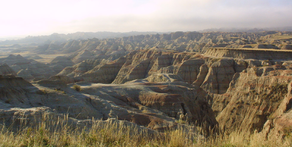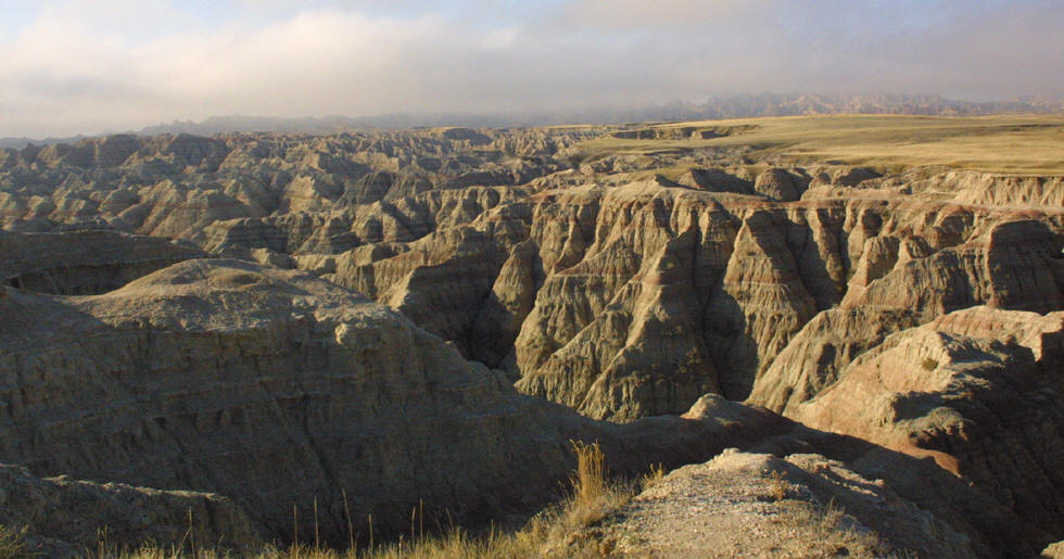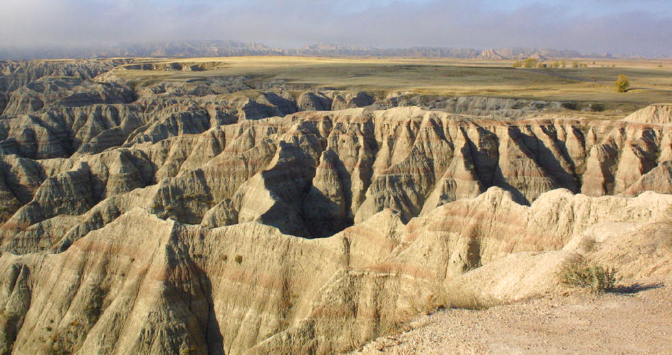 Left: An early morning fog cast shadows on the prairie, and on the assorted Badlands formations. Fog, as well as rain, are rare phenomena here. Below: Heading down into The Badlands. |