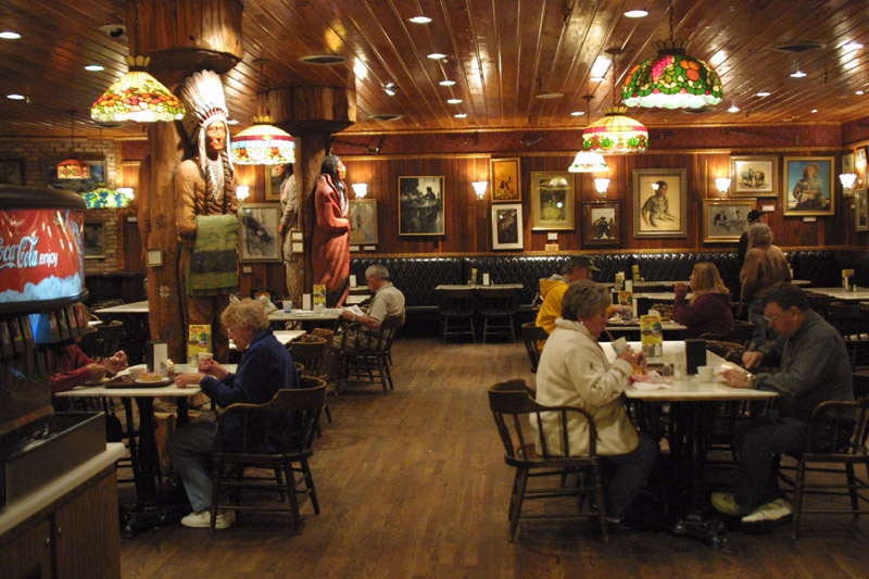 Above: Just out of The Badlands, and approaching Wall. Left: The Wall Drug main dining room. The man to the right of the photo is not sick from the food. He is reading a plaque at the bottom of one of the wood carvings. |