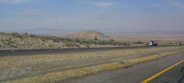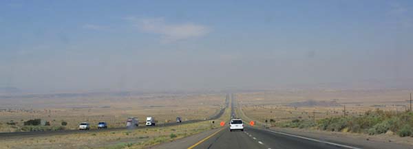 The road, in this arid terrain, vanishes off into the haze. |