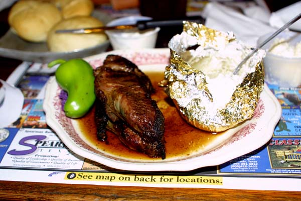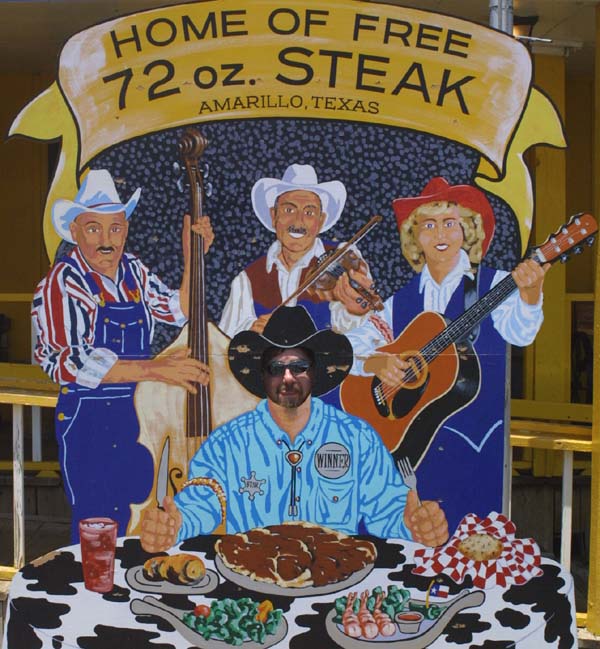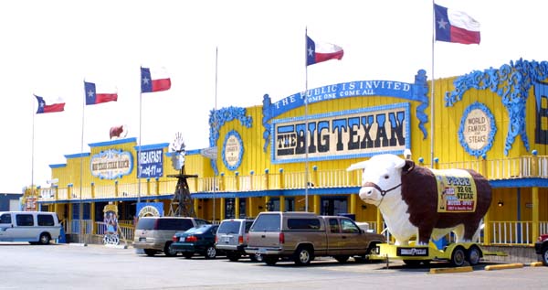 I said we would get back to this. Here is the famous Big Texan Steak House. Where you can get a free 72 ounce steak, shrimp cocktail, salad and dinner, provided only that you can eat it all within an hour.