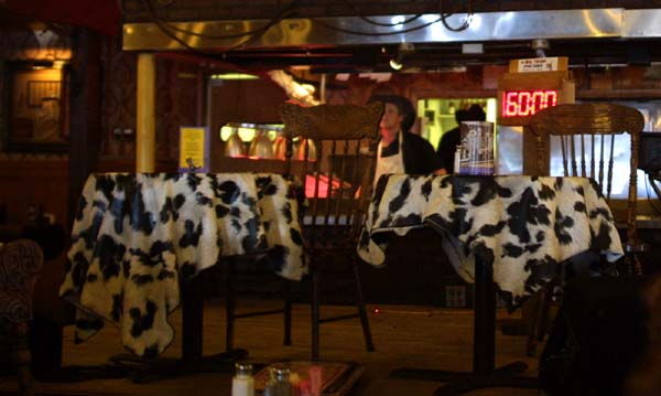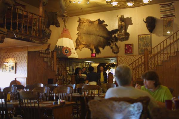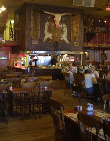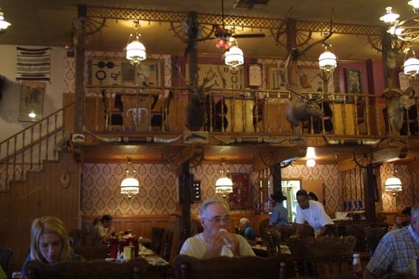 A couple of views of the dining room from within the Big Texan. There is dining on an upstairs balcony, as well as on the main floor. Western art, motifs, and knick knacks fill the walls. The kitchen is located under the large skin and cattle skull.