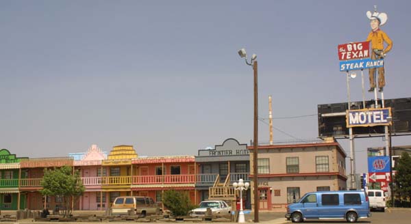 The sign which lures travelers to the Big Texan. Connected to the restaurant is a motel, designed to look like a series of little western motels. A place to stop for those who attempt the 72 ounce steak, and find themselves a bit indisposed.