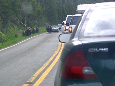 A herd of buffalo intermingle with automobile traffic as they (the