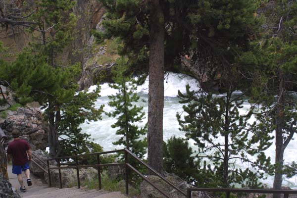A stairway takes one down and along the raging waters of the Yellowstone