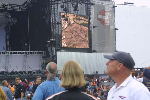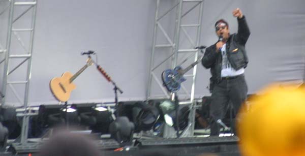 Smile!We consider an aerial photo of ourselves projected on a large screen flanking the stage. There are an estimated 150,000 people gathered here. |