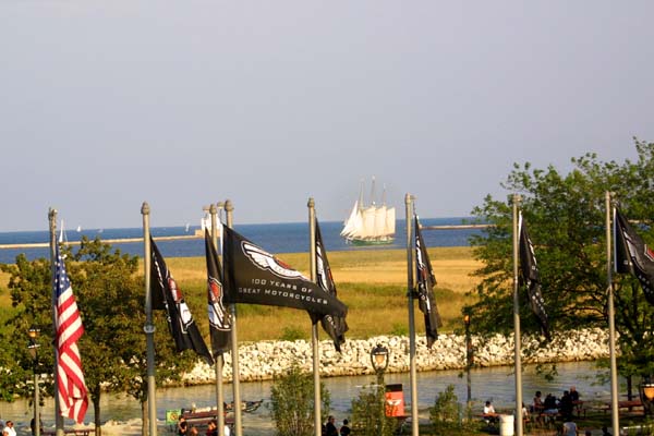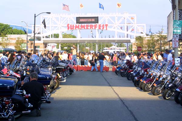 gate to the Summerfest grounds. Flanked on both sides by a motorcycle