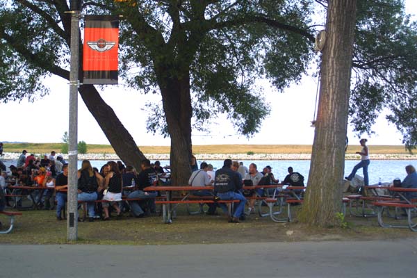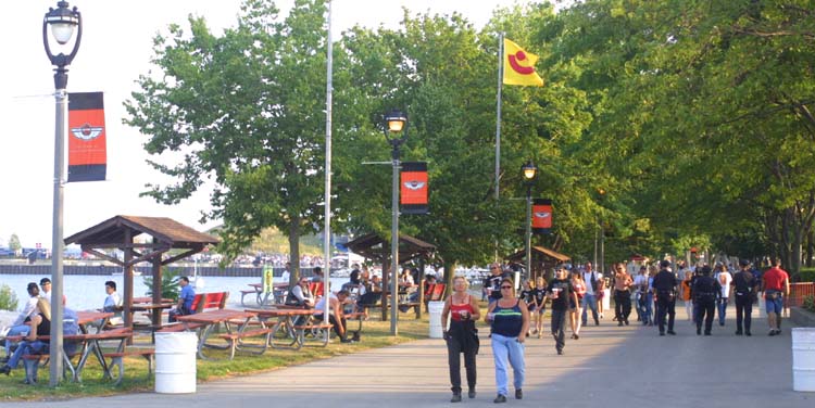 | Above: A sort of a promenade is formed by a line of trees along the lake front. Left: Lining up to watch balls of iron, at the Extreme Sports stage. |