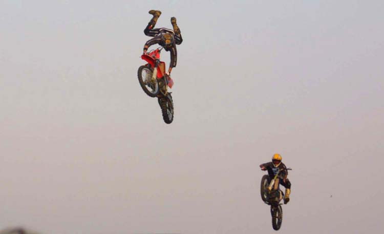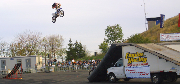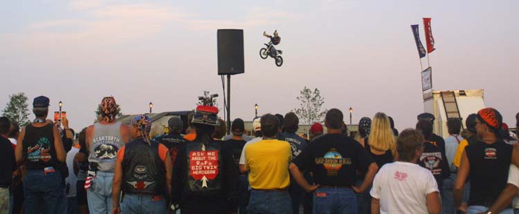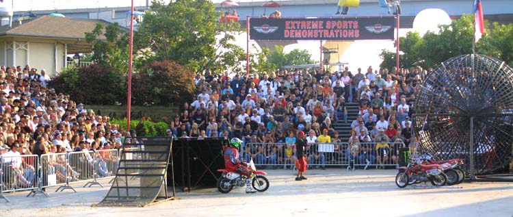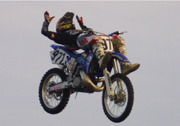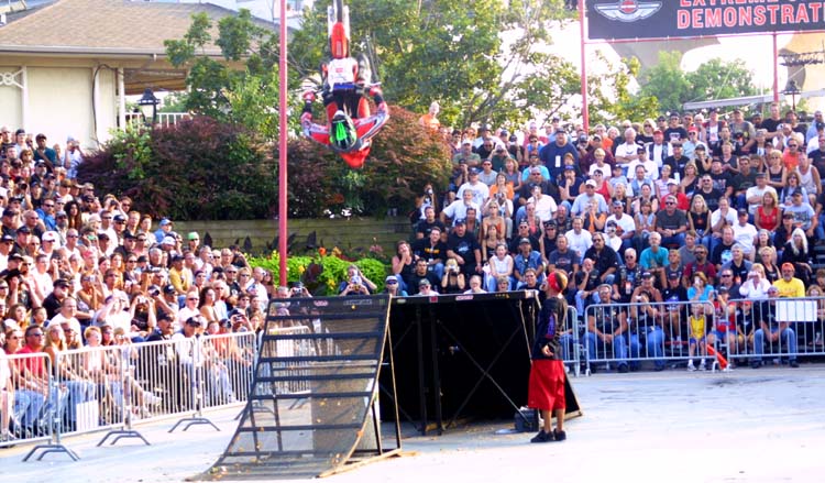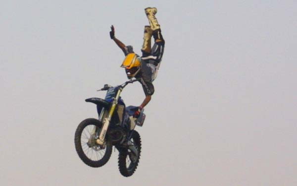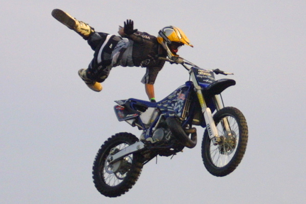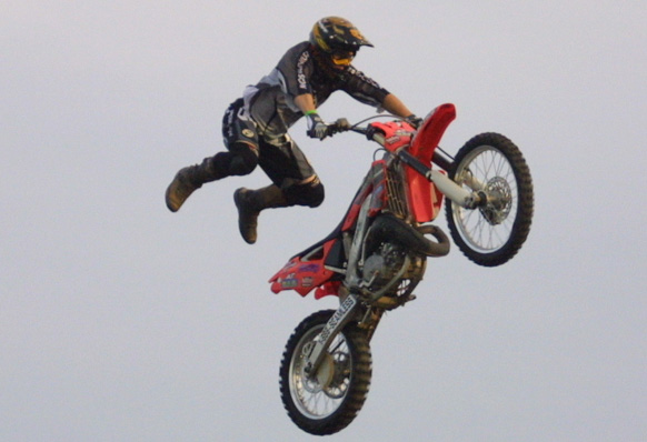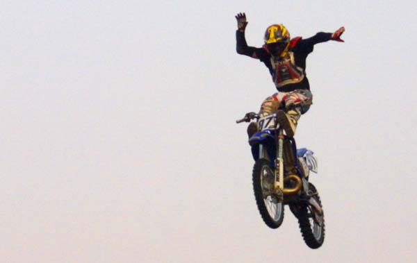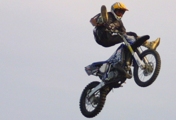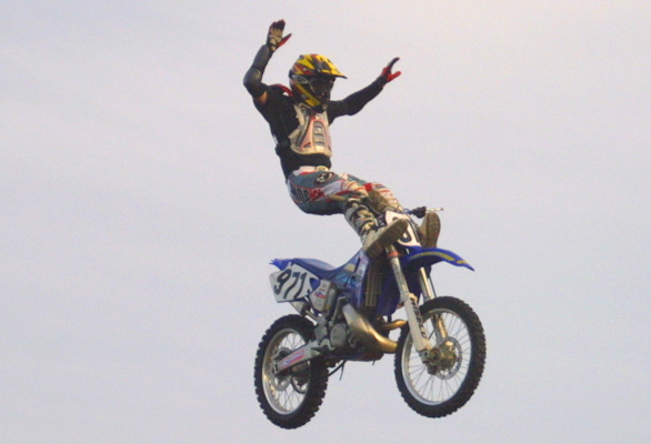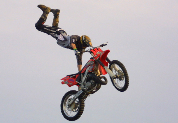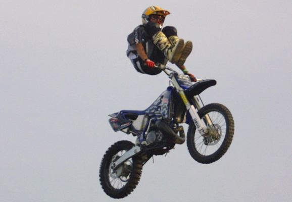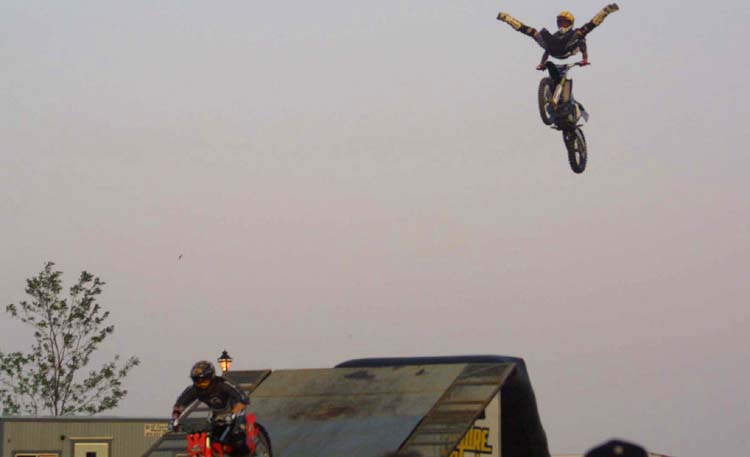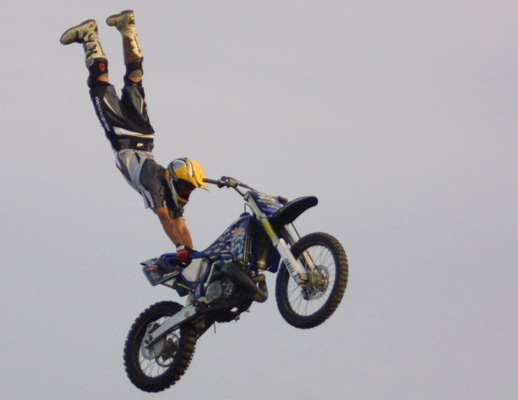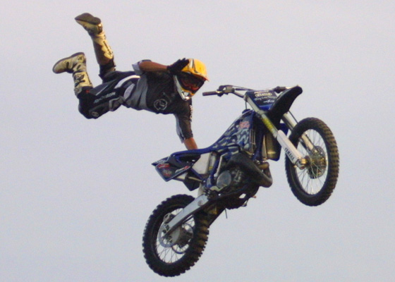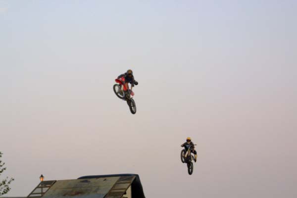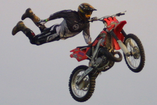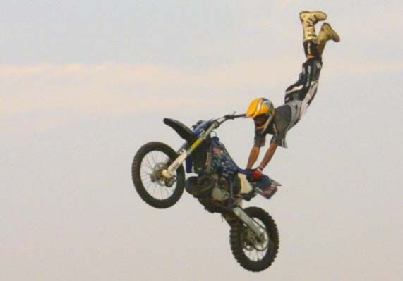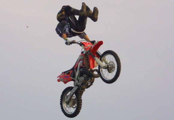 | Above: What in the world is going on here. I see motorcycles flying through the air. Understandably, there is a large crowd gathered to watch. Left: This rider is perhaps 25 feet in the air, and doing tricks before he lands. |