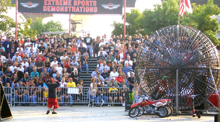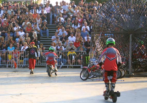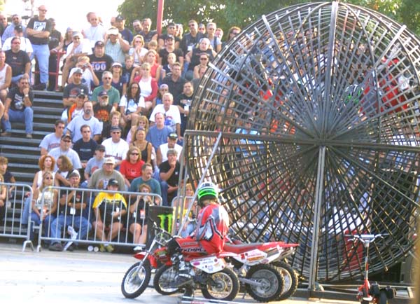 down. Below: A rider jumps a ramp, and turns upside down, and multiple riders inhabit the cage, riding in circles without hitting each other. |