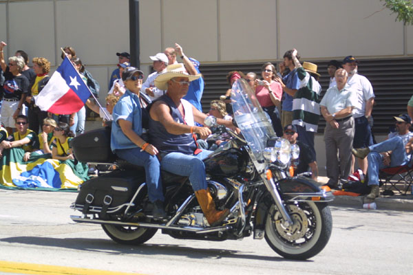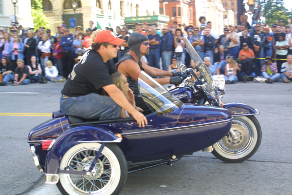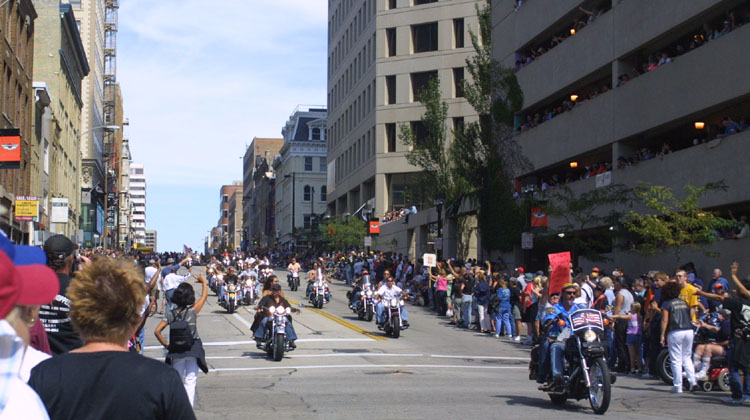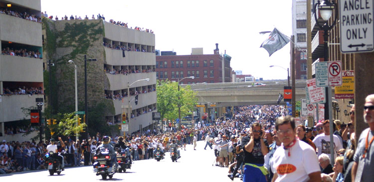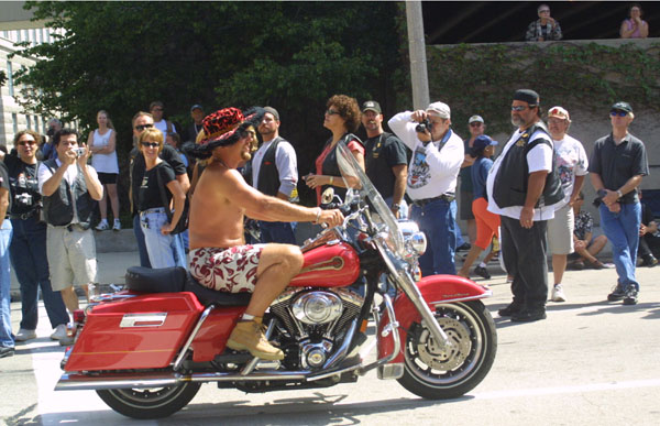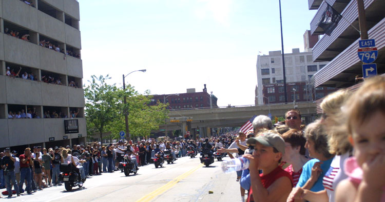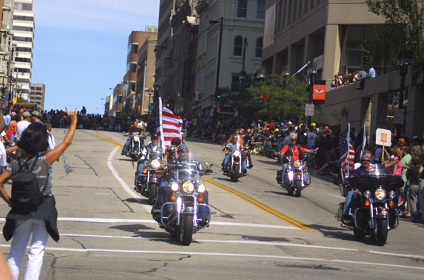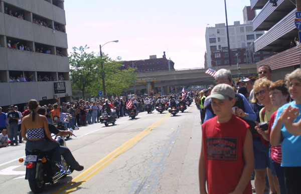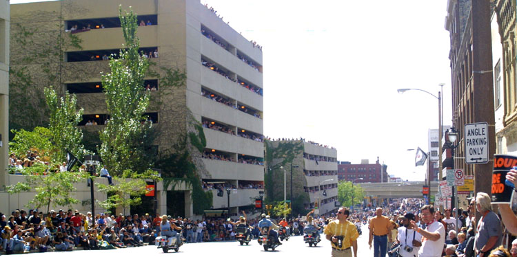 street for the riders to pass. Vendors, and parked motorcycles fill the side