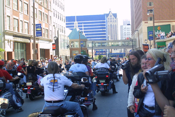 the riders are surrounded by Wisconsin residents aiming things at them and