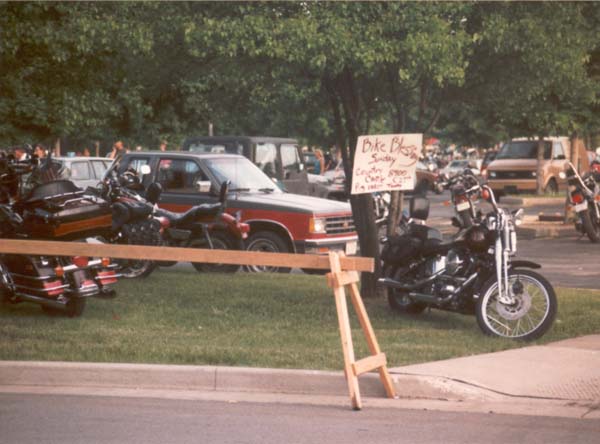 A sign posted on a nearby tree informs us of the next day's bike blessing.