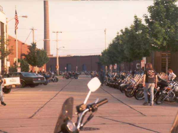 this largely industrial and warehouse area are filled with motorcycles. |