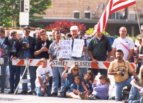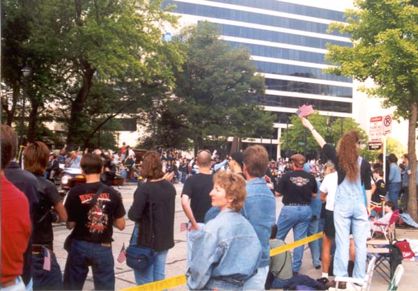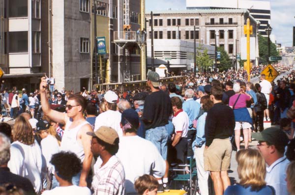 of Michigan Avenue. Spectators continue to spill out onto the street and