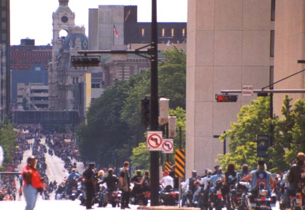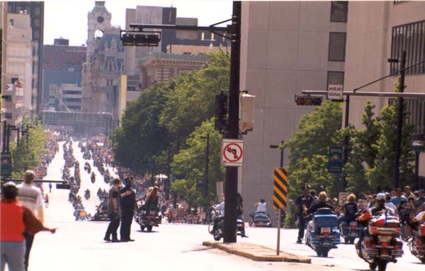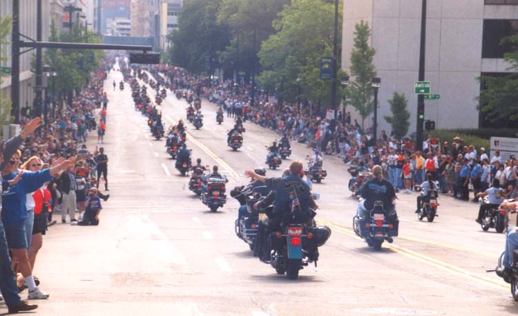 Avenue, towards the river. Several files of motorcycles form long lines all