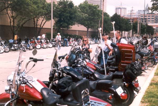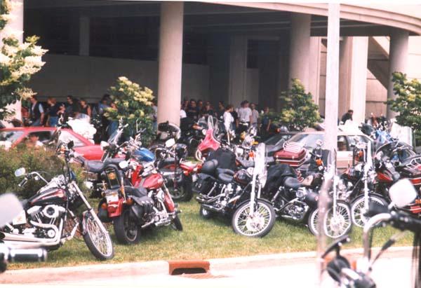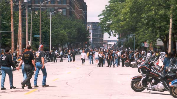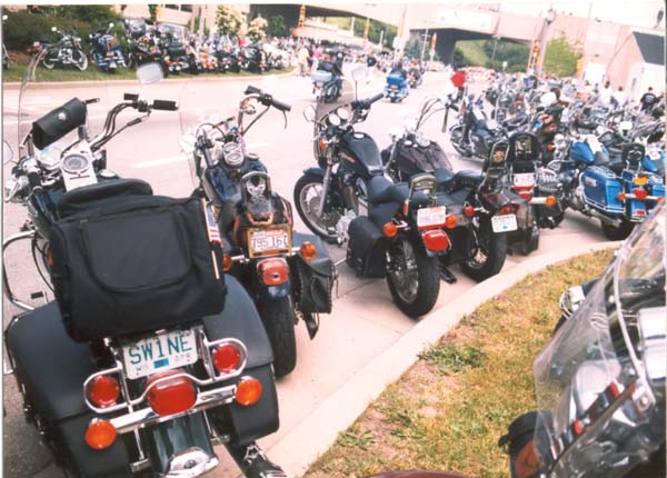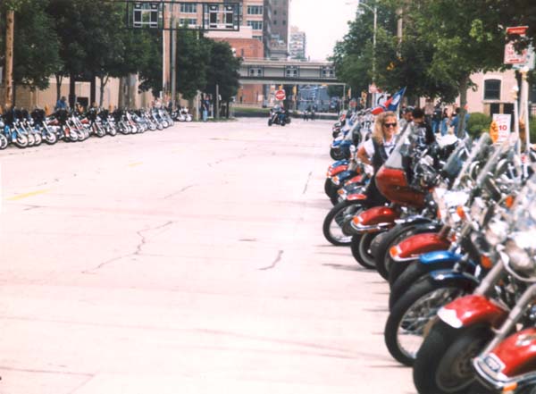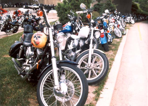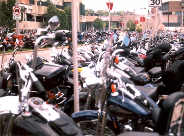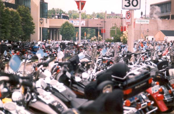 sea of motorcycles. The building to the right of the photo is the War Memorial