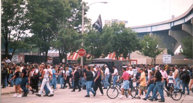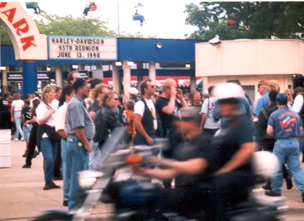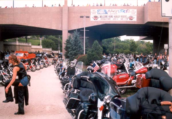 overpass filled with visitors and well wishers. Motorcycles fill the streets
