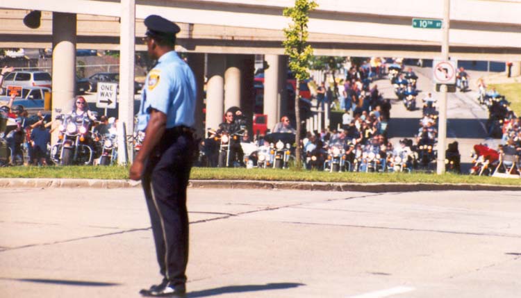 blocks into the parade route. City workers, auxiliary police, and volunteers