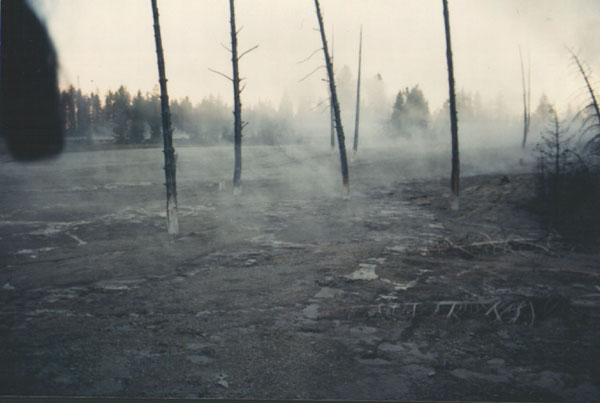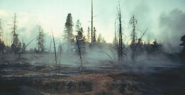 A geyser basin encroaches on the edge of a wooded area, much to