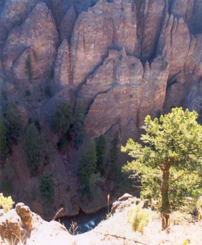 A notch in the sharp edged formations which line the canyon.