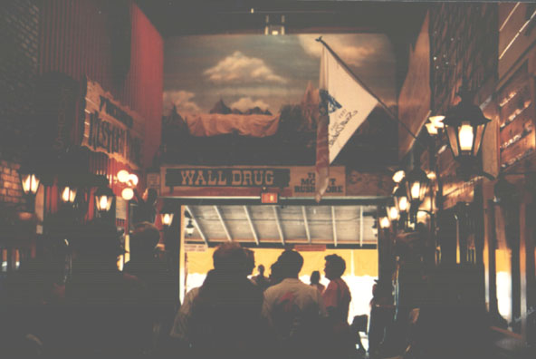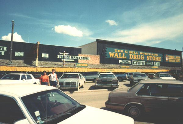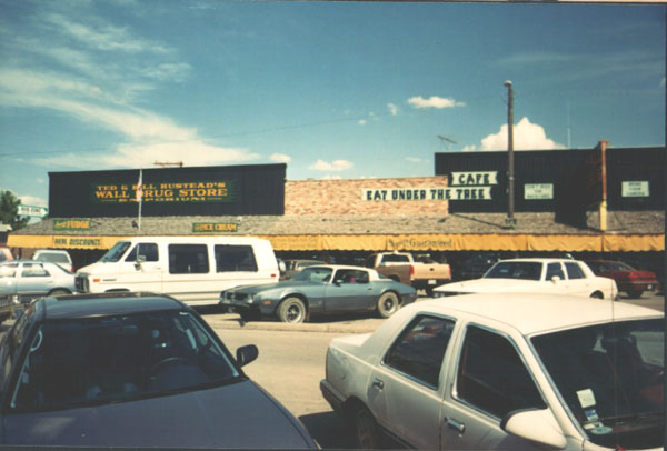 Stereotypical "picture postcard" view of Wall Drugs. A vacation traveler's tradition, for decades. Inside, are several restaurants, an assortment of gift shops, and sundries, film, hardware, clothing shops, a gun and knife shop, books, jewelry, dinosaurs, Indian crafts, a penny arcade, an art gallery, and , oh yes, a drug store. |