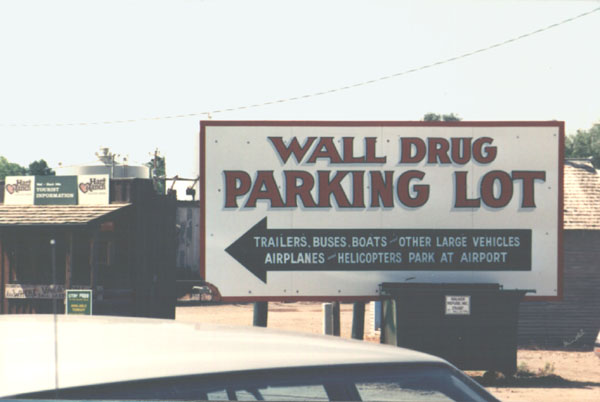 This is the Mecca of tourist traps. Wall Drugs has signs posted all over the world, telling prospective customers, and travelers how far away, and in what direction, it may be found. Most of these signs announce the Wall Drug trade mark of "Free Ice Water". |