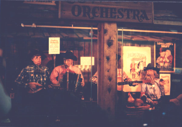 The renowned, and original, wall Drugs, mechanical cowboy band. Often imitated, never equaled. The mechanical figures perform cowboy songs through a loud speaker system, while they go through the motions of playing their instruments. |