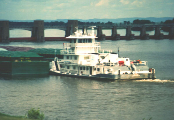A workboat on the great river. these boats push huge collections of barges, out in front of themselves. The barges are all chained together, and there are men whose only job is to walk up and down the row of barges, and tighten chains, making certain that none are allowed to go slack. It is dangerous, and physically challenging work. |