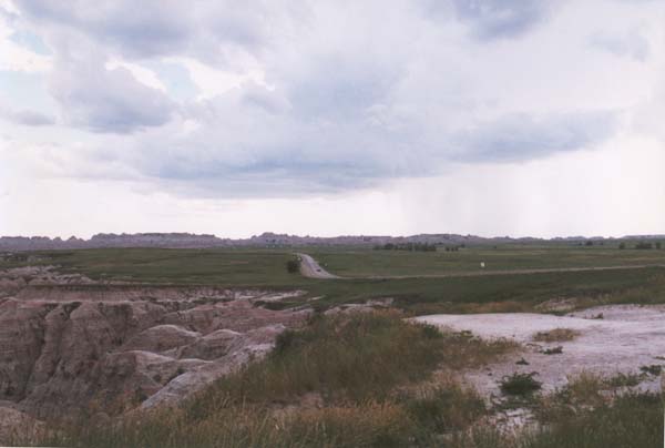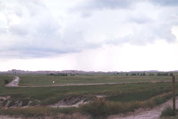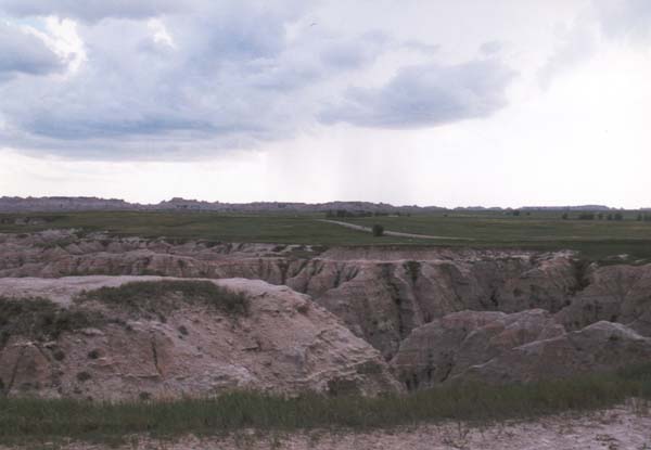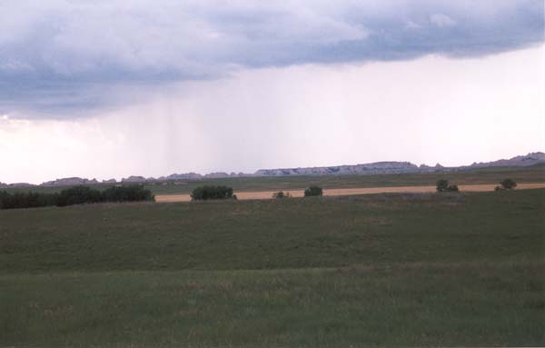 Off in the distance, rain can be seen, still falling in some remote part of the Badlands. |