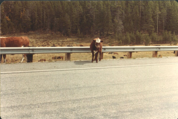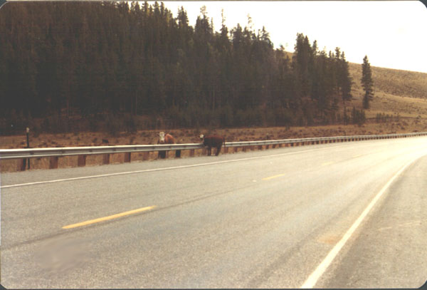 A calf out on the road, and what seems to be his mother. Both seem pretty concerned about how he got out there on the road. They also seem equally uncertain as to what might be done about it. |