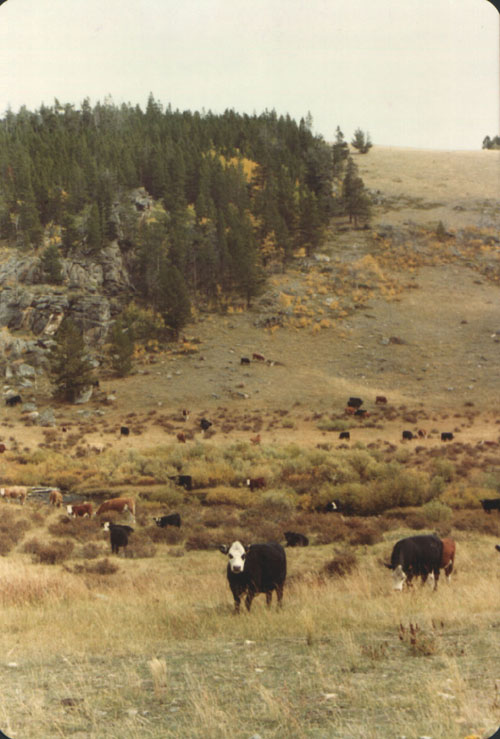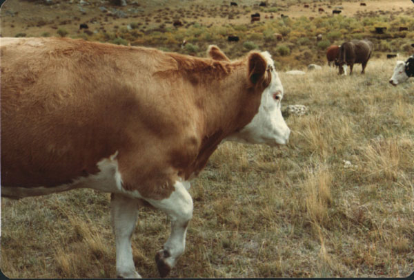 In some ways, the old west lives on. This country is, or at any rate was, still open range. The cattle would be allowed to graze freely, all over the area. The roads were broken in many places by cattle grates, and there was no shortage of "cow pies" scattered about the landscape. I noticed that the cows had little tags in their ears, to identify them for their owners. I saw no cowboys riding horses, and throwing ropes, but did see a number of them riding pick up trucks, and checking their herds. The way they smiled, and rolled their eyes as they caught a glimpse of me standing in the road photographing their cattle, made me feel like a typical bonehead tourist. I suppose they were as amused as I would be by a country boy coming into town, and craning his head at the tall buildings, and at all of the traffic. |