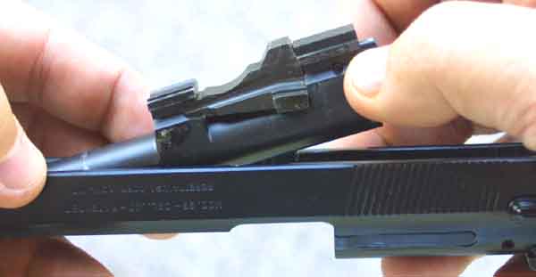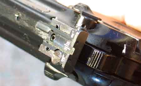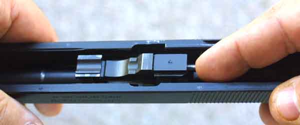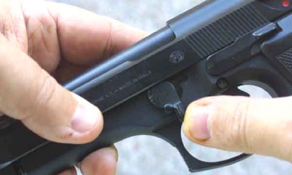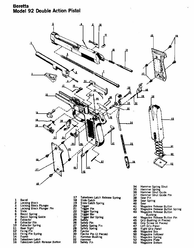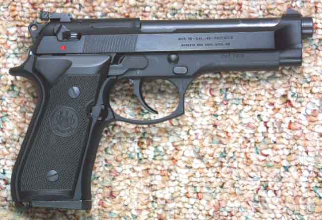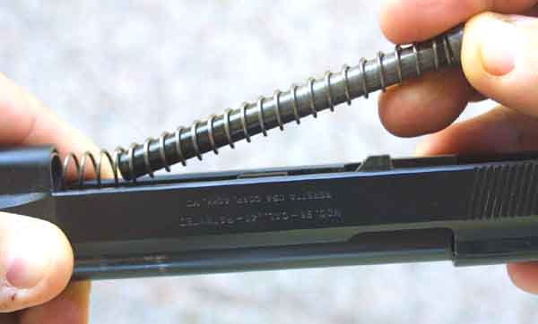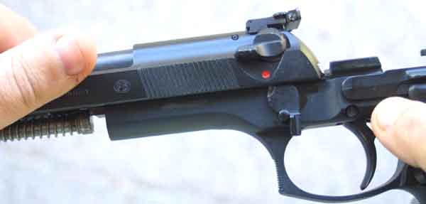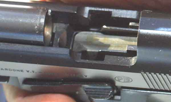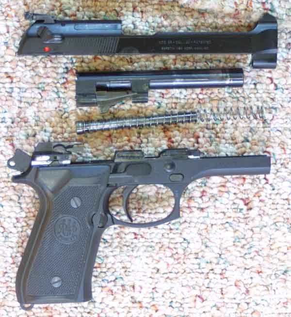 matter of weight and cost; but mainly it was one of logistics. It appeared that the outcome of the next major conflict would be decided in Europe, and the European The M-92 version of this gun, in 9mm, has been adopted by the U.S. Army, as the M-9 service issue handgun. Both the switch, and the new caliber, were not greeted with much enthusiasm, by fans of the classic M1911 handgun in 45 auto. The switch was made for a number of reasons. The military had been considering Well, of course, nothing worked out according to plan. The Army soldiered on, with the M1911, for several more decades. The big war in Europe never happened, though numerous conflicts broke out in Asia, and the Middle East. The gun eventually procured is almost as heavy, and even bulkier than the old M1911, and logistically, we still have multiple calibers, since many American military units, as well as some allies, are still issued M1911 pistols. Well, what do you expect? It is, after all, the government. The controversy continues. Most people, who are firearms enthusiasts, consider the 9mm to be inferior to the 45, though it is still a matter of considerable debate. There are many who point back to the time, a century ago, when the United States dropped the 45 Long Colt, in favor of the 38 revolver, only to find that the new caliber was ineffective against marauding Morros. A few of the old Peacemaker revolvers, in 45 Long Colt, were still around, and these proved be be quite effective, even where the new 38 caliber had failed. So the Army quickly switched back to the big bore pistol, when they adopted the M1911. There are those who shake their heads, considering that fanatical muslim fundamentalists, our most likely enemies for the next decade or two at least, will probably be about as tough to kill as had been fanatical morros. Quite a bit of the controversy could have been defused, by going with the 40 S&W version of the big Beretta. There were other criticisms, however, relating to the guns themselves. For one thing, many here were not happy about procuring a major piece of military The Germans, and the Italians were allies, during the Second World War, and there was much exchange of technology, manpower, and resources. Due to this sharing, when Beretta decided to embark upon the design of a full sized service pistol, their point of departure was the German P-38. The M-9, and all of the full sized Berettas, share the dual locking lug action of the old P-38. Since this action type requires no locking logs on the barrel, or down the top of the slide, the top of the slide can be milled away, leaving the action open. the lugs of the Beretta action, fit into a pair of grooves milled into either side of the slide, which can be seen in the photo above. This action type dispenses with the tilting barrel; but has not been widely adopted. Even Walther no longer uses it, in it's newest designs, having moved to a Browning style of action. Disassembly