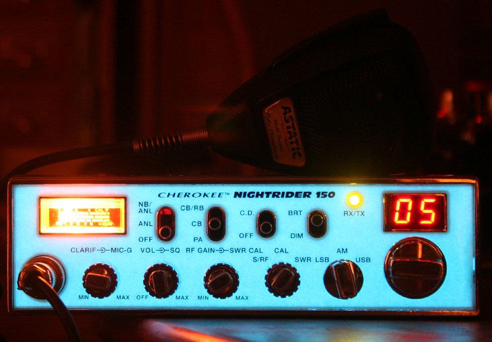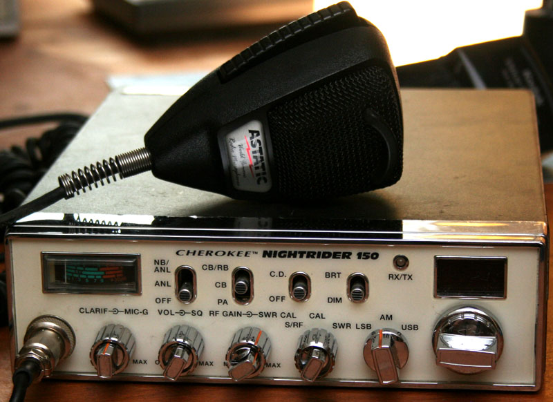 as well). This was the Cherokee featuremate of the Cobra The 150 model is distinguished from the Nightrider 100 by its capability of working in SSB mode. These are sometimes referred to as 120 channel units, though it is not really a true 120 channels. Every AM transmitter produces three sets of frequencies on transmission. There is the AM carrier, which is the frequency upon which it is said the transmission is being made, and then there are the side bands. An upper sideband is the carrier plus the frequency of whatever it is that is being transmitted. the lower sideband is the carrier minus whatever it is that is being transmitted. So if you are humming at 10 KHz, and transmitting on 27 MHz, your transmitter will be sending out signals at 27 MHz, 27. 01 MHz, and 26.99 MHz. An SSB transmitter will strip away everything except the upper or lower sideband, and put all of the transmit energy into the single sideband that is left. Upon reception, the SSB receiver will reintroduce the carrier, and add a mirror image of the received sideband to fill in for the one that was removed at the transmitter. There are a number of advantages to this. For one thing, you can get twice as many channels, since it is possible to have communication on both sidebands at once. Many radio manufacturers claim that you can have three times as many (120) channels; but strictly speaking this is not true. Though both sidebands can be used at once, neither sideband can be used while an AM transmission is being made. The biggest advantage to SSB is that it essentially triples the signal power, since the power that was going into the carrier and the other sideband can now be concentrated into the single sideband being transmitted. This is why many radio manufacturers will state a 12 watt power rating for an SSB CB radio. I promised myself years ago, that I would never get a CB radio that did not have SSB capability. This was not so much because of the power advantages, but mainly because I would hear the occasional SSB transmission, and did not like the idea that I could not hear everything that was going on. In truth, for local communications, at four watts on CB, sideband is not really required. Still, it's nice to have the option. Sideband capability is a nice feature, and is probably the most significant feature of the radio, but it is not the only one. The radio has adjustable RF gain and Mike gain, which can be handy, and can help when operating in congested environments. It also has a compressor circuit, which Cherokee called Clear Drive. This circuit is similar to the Sound Tracker feature that some Cobra radios have. The compression can be useful, but it is only usable when communicating with a similar radio. The radio also has the usual features of squelch, noise blanker, and the ability to function as a PA. As with all SSB radios, this unit has a clarifier, which is used to fine tune reception of SSB signals. Such a control is known as a BFO on a SW radio. During AM transmissions, the clarifier has no effect. Less useful is the Roger Beep feature, which sends a short tone at the end of a transmission when the mike is no longer keyed. Fortunately, this feature can be easily turned off, which is how I have my radio set up. One great feature is the ability to measure SWR, for antenna tuning. This is nice for initial set up, and can be useful for magnetic antennas, which might not always be mounted in the same place. It should also be a bit more accurate than using an outside meter which would need to be connected by a short length of patch cable. The final feature of the radio, and the one from which it gets its name of the Nightrider, is the illumination of the front panel. This is a simple sheet of electroluminescent material, which is pasted to the front of the unit. Cherokee called this light pipe technology, though true light pipe uses fiber optics. Actually, I think the electroluminescent material is neater than a fiber optic light pipe system. The face of the unit appears white in the daylight. Overall, I like the unit quite a bit. CB is not what it once was, which is a mixed blessing. The band, as I remember it, was nearly unusable years ago. Now there is some traffic, and the radios are once more fun for general communications between cars, and locally. CB is still a popular and viable means fo communication, and requires no license. This can be a huge advantage, when you are traveling with unlicensed friend or family members, and what something a bit better than the low power, high frequency of FRS. CB radios are allowed good quality external antennas, and about ten times the power of FRS. Several miles fo range exists between a pair of full power CB walkie talkies, and perhaps ten or fifteen miles between a pair of mobiles. Bases are known to be able to communicate over 20 - 30 miles, or more, with proper antennas. Then there is skip. A number of people have expressed the belief that CB may be making a comeback. Unfortunately, they have been saying this for years. Certainly the distributers of the Cherokee line thought so, ten years ago. What a pity they were so wrong. Even so, the band is probably as popular as it had been back in the sixties an dearly seventies, before the big trend hit.