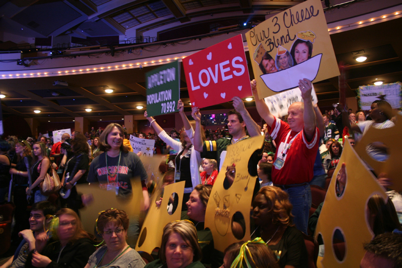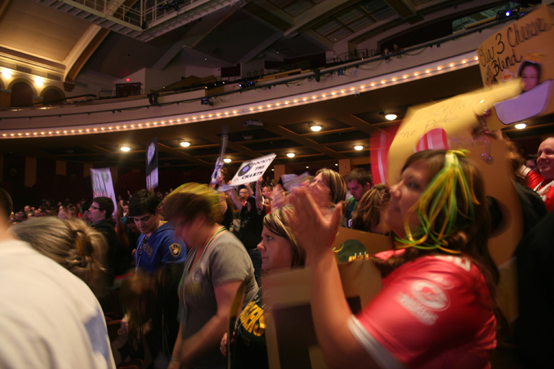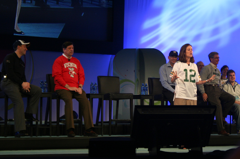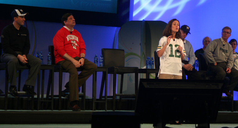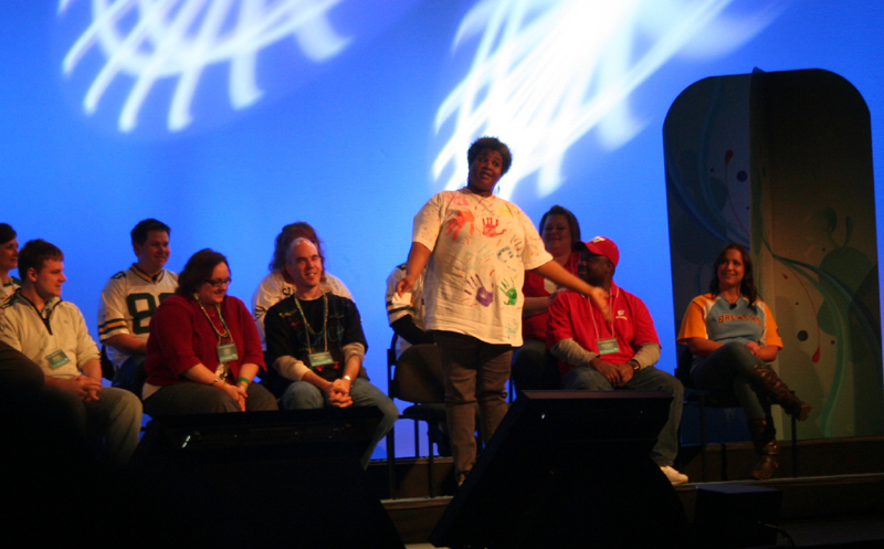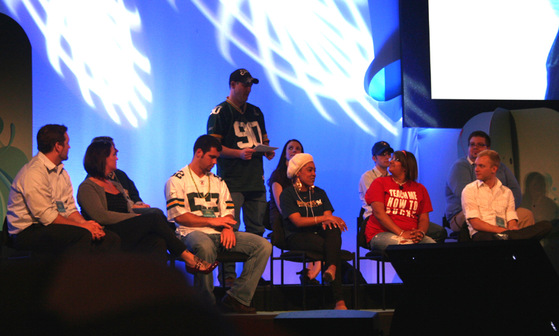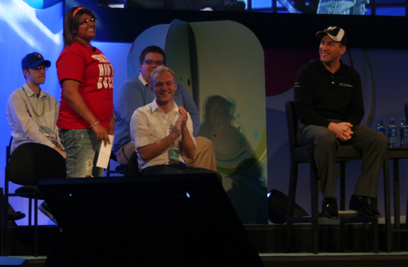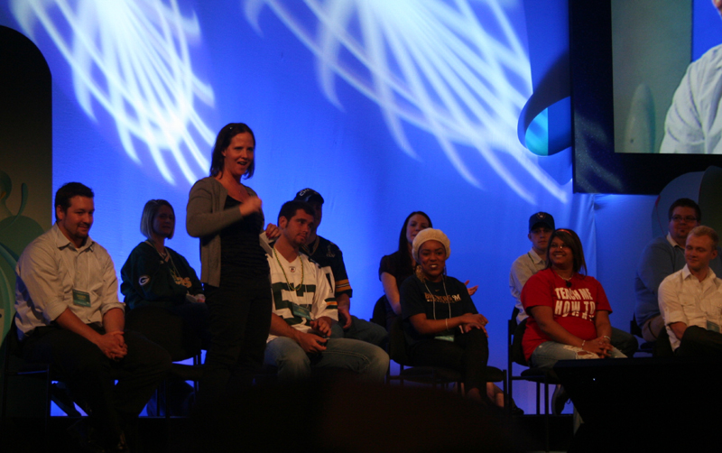 Mary asking, "Does anyone in the audience have anything that dissolves Super Glue? It was all over our water bottles, and now our hands are stuck." |