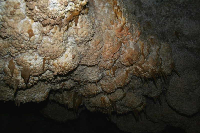 Looking as if they just froze in place, these larval stalactites are hundreds of years old, and will not achieve their goal of reaching the cavern floor for many thousands of years more. |
