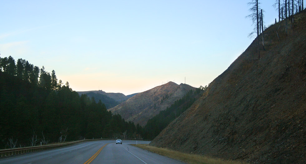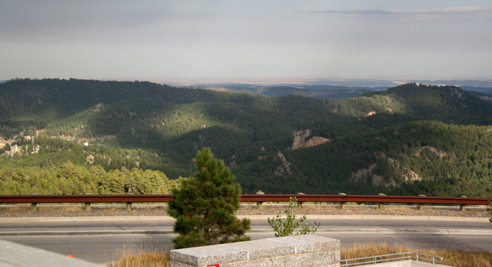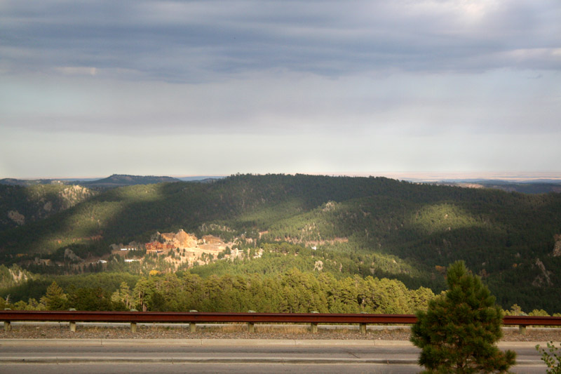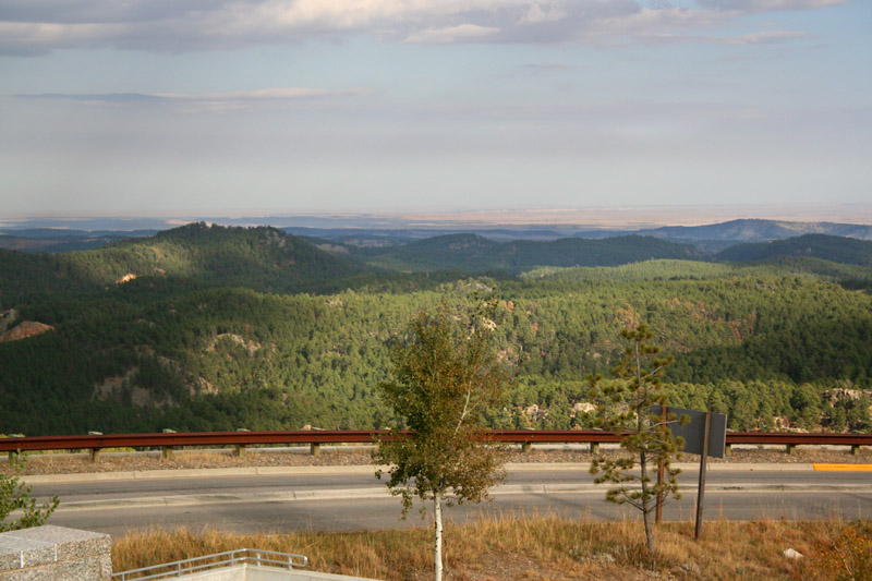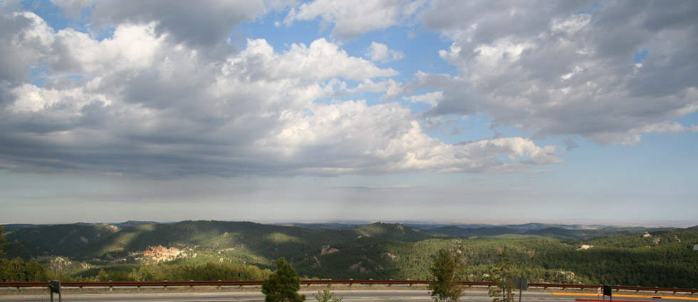 Above: The entrance to Mount Rushmore, with the sun starting to go down. Left and below: Some of the hills, facing the monument. The partial could cover helps to show the depth of these hills. |
