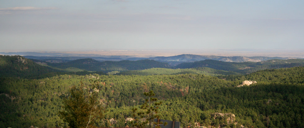 Some of The Black Hills. A look at the horizon, shows the surrounding dry plains, outside of The Black Hills, as a ring of yellow surrounding the green. |