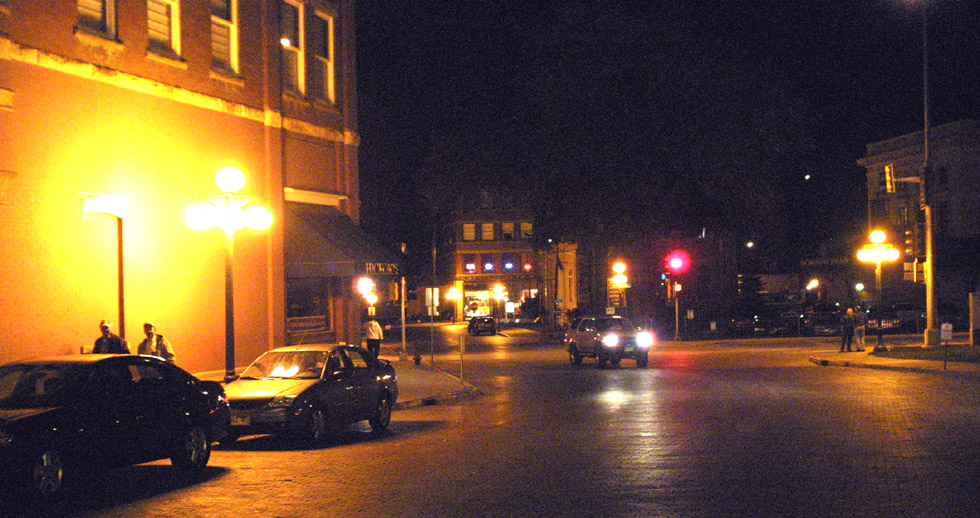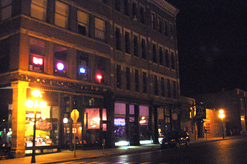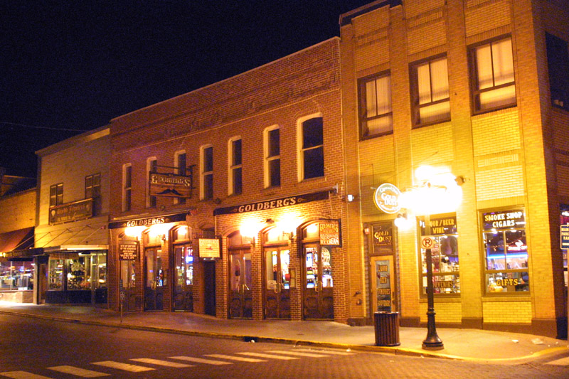 A look up the street, past the Gold Dust, to the old Franklin Hotel. |