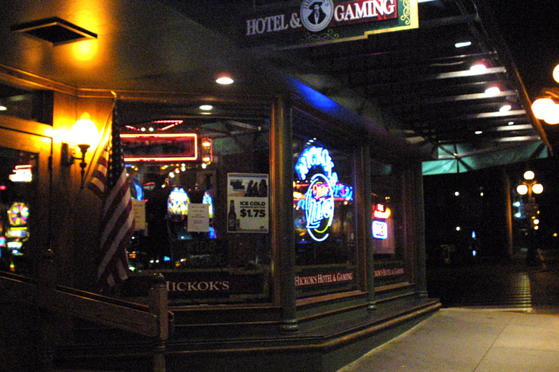 Deadwood has become quite the tourist area. It is famous for it' sold cowboy haunts, and for its main street, lined with casinos and hotels. Shown here is the entrance to Hickok's. |