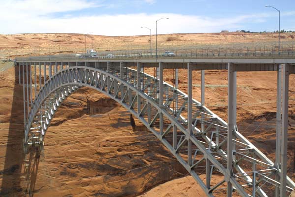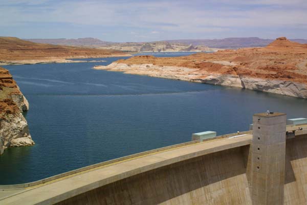 | The Glen Canyon Dam. This pretty much divides Utah from Arizona, and forms Lake Powell from the overflow of the Colorado. The chalky leached out rock along the river shows what the water level usually is. We came amidst a dry spell. cars are no longer allowed on the dam, nor are people allowed near without being searched. The dam was built in 1963. | |