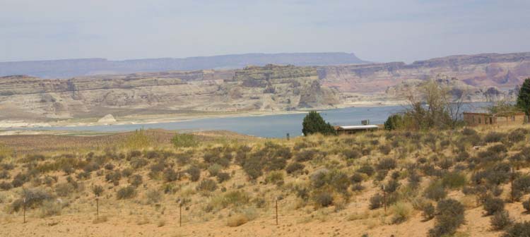 | More of the desert and rock formations of Utah. The water in the foreground is a bit of the 180 mile long flooded out Colorado River, known as Lake Powell. | |