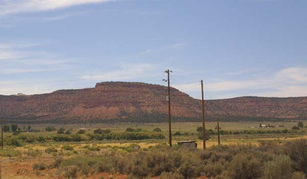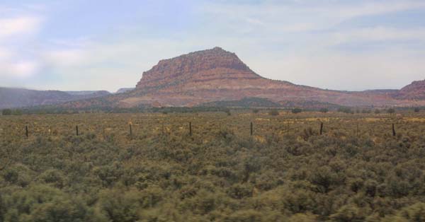 | A few peaks, some fencing and an advertisement. We will soon be in Kanob, and then enter the wondrous area of Zion. The desolation is now broken by occasional glimpses of civilization. | |