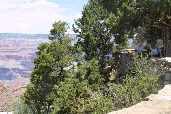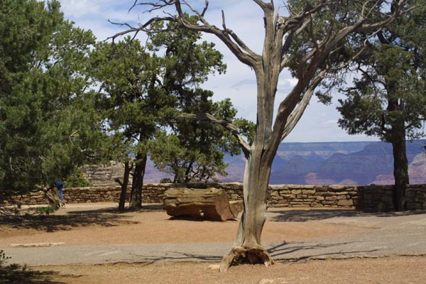 A partially shaded rest area welcomes visitors along one of the rim