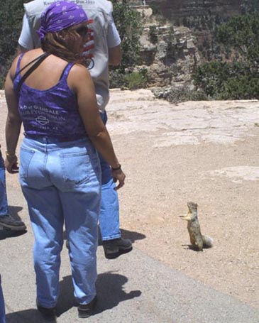 A beggar plies his trade on an unwary tourist. This is common in all of the parks. I have seen it in Yellowstone, and Zion. It is illegal to feed them, but many succumb to the obvious appeal. Some patches of green can be seen at left, near a