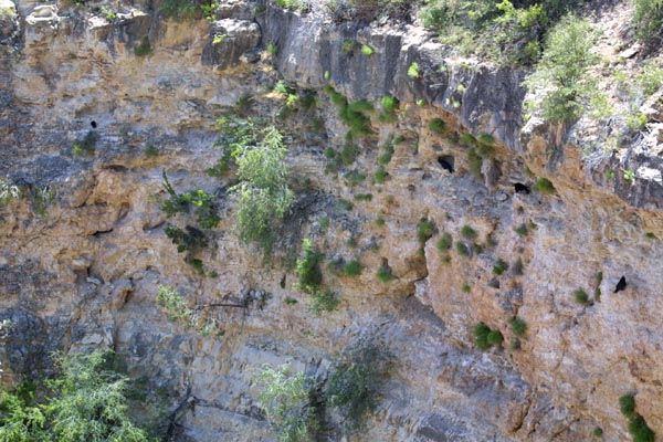 | Just under the rim of the canyon, ravens and a few condors make their homes in little hollows in the rock. | |
