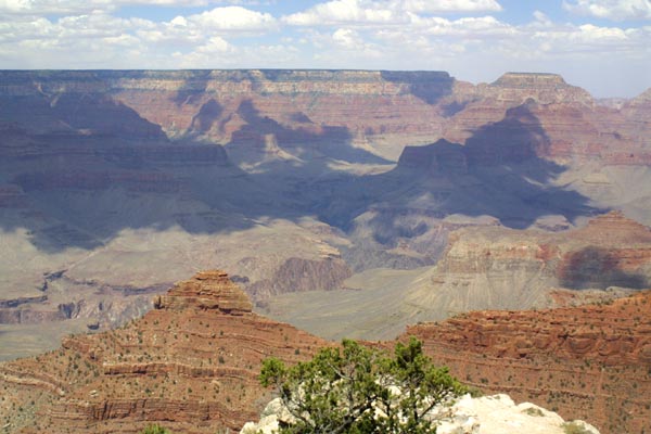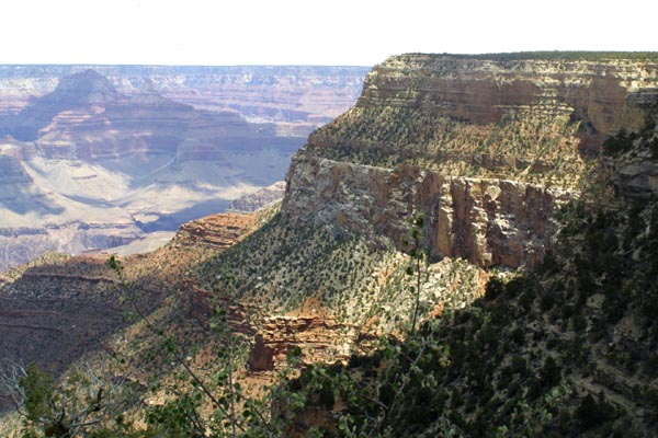 | Yet another view of shadowed canyon lands. The haze hints at the heat. Actually, the whole place was very dry, as well as being very hot. At least some of the haze was from several far off, but huge, fires ravaging the area. | |